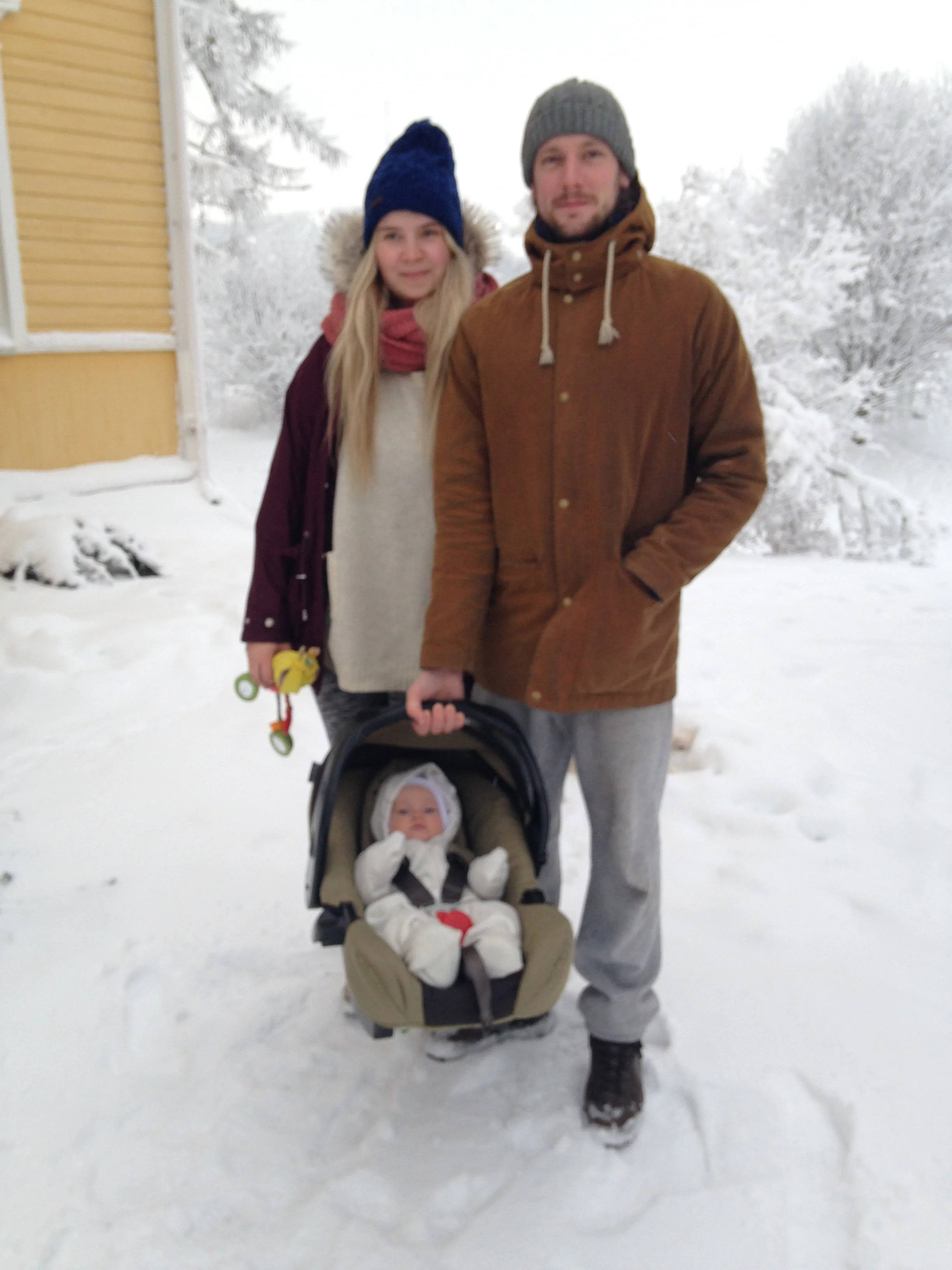 Visiting Kaisa’s family for the first time with 6 month old Freya outside of Haapala house.